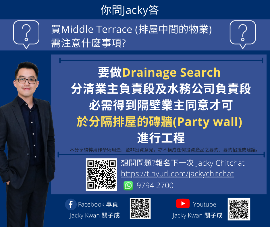 👨💼Jacky答: 進行工程時必需留意Party Wall Agreement,做Drainage Search分清業主負責段及水務公司負責段。